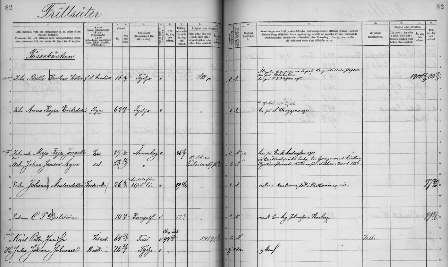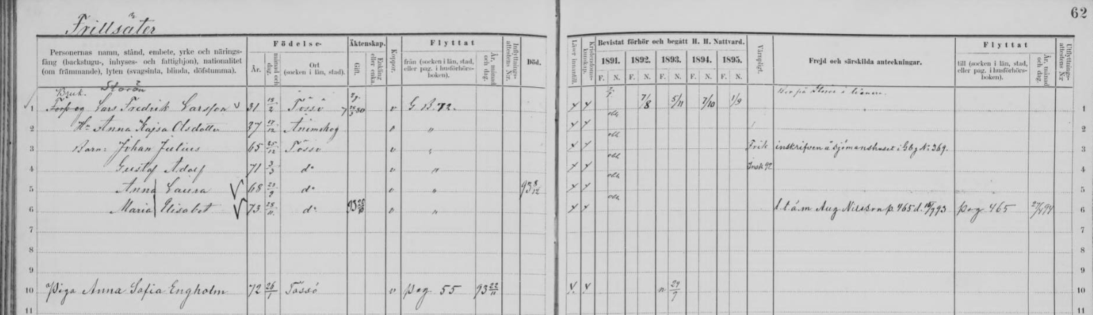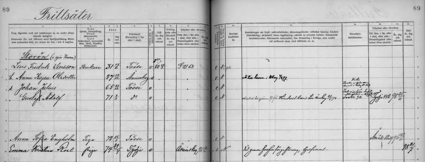| 1864 | Frillsäter | Karl Peter Jansson | Hustru Julia Johanna Joh.dr, född 1872 | ||