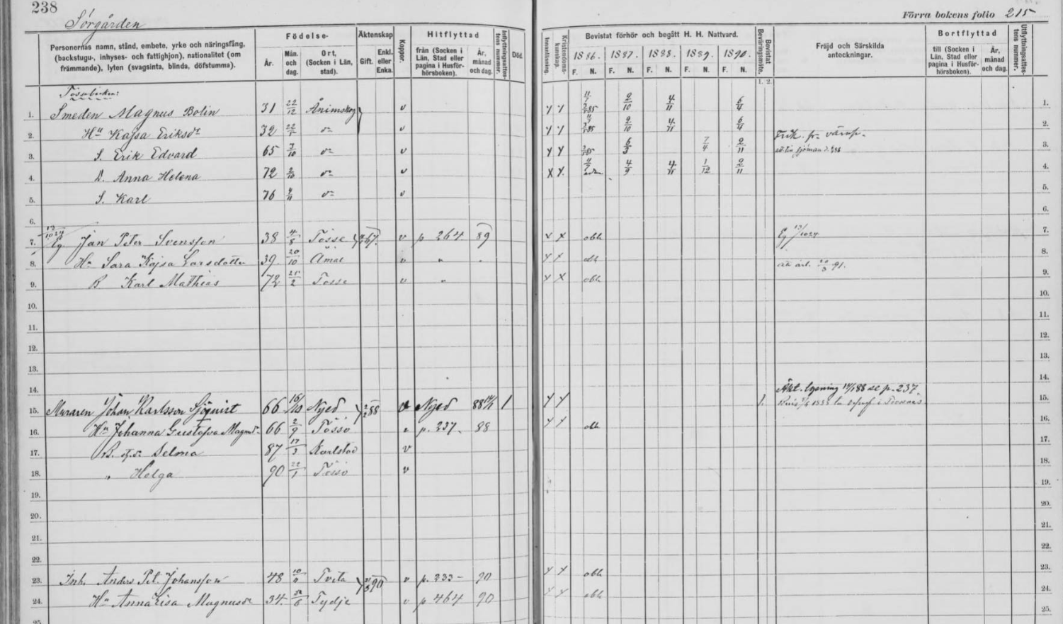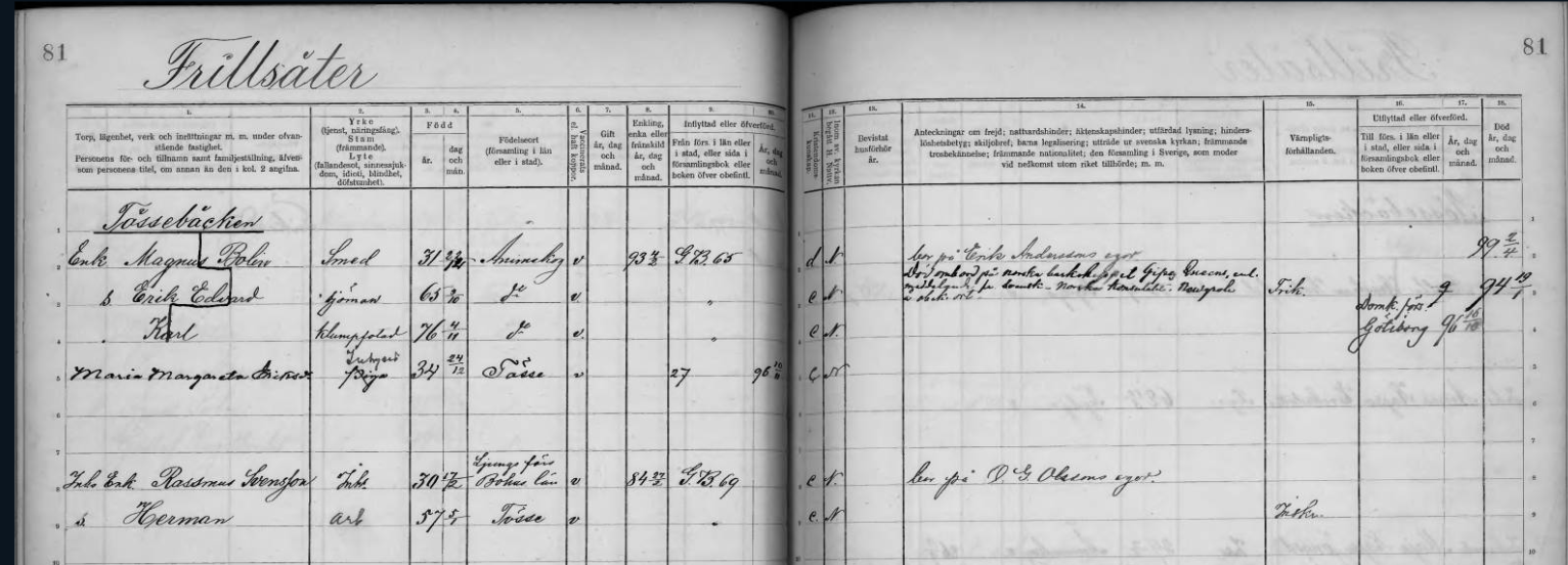 | 1831 | 1899 | Frillsäter | Magnus Bolin | Smed, född i Ånimskog, änkling 1893 hustru Kajsa Eriksdotter f 1832 i Ånimskog son Erik Edvard, f 1865 i Ånimskog dotter Anna Helena, f 1872 i Ånimskog son Karl, f 1876 i Ånimskog | |