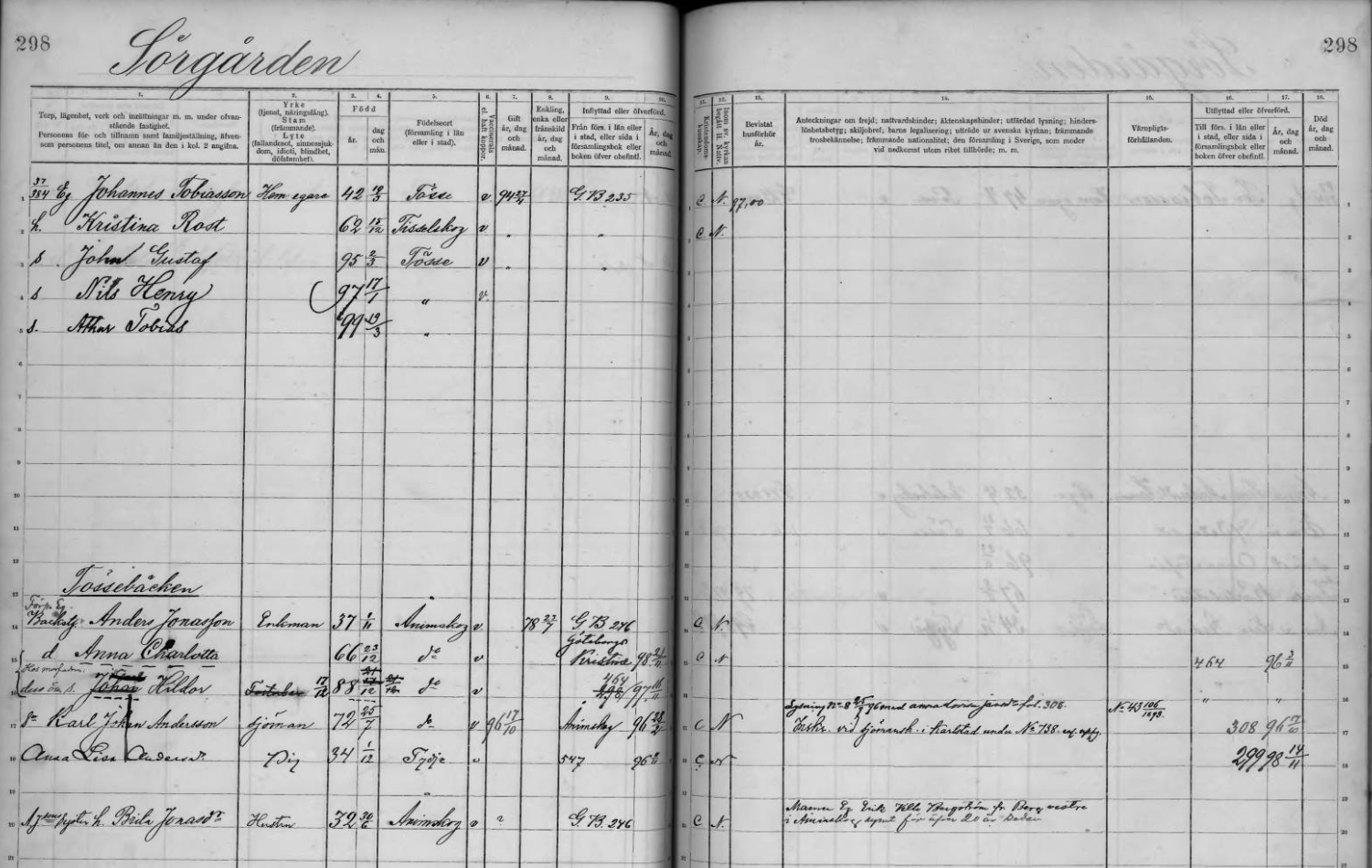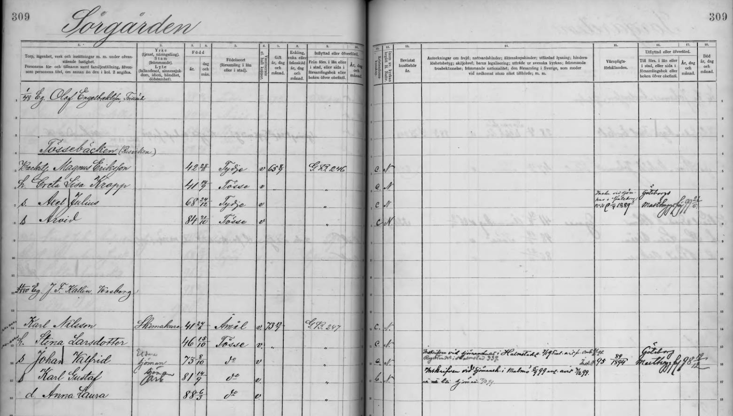 | 1854 | 1931 | Södergården | Johan Robert Rassmusson | Risviken Född i Tösse h Britta Kristina Johannesdotter, f 1857 i Tydje s Karl Petrus Johansson, eldare, f 1884 i Tösse s Herman Robertsson, sjöman, f 1887 i Tösse d Walborg, f 1892 (dotterdotter Rut Ingrid f 1818) d Edit Kristina, f 1897 i Tösse d Ingeborg Eleonora, f 1902 | |