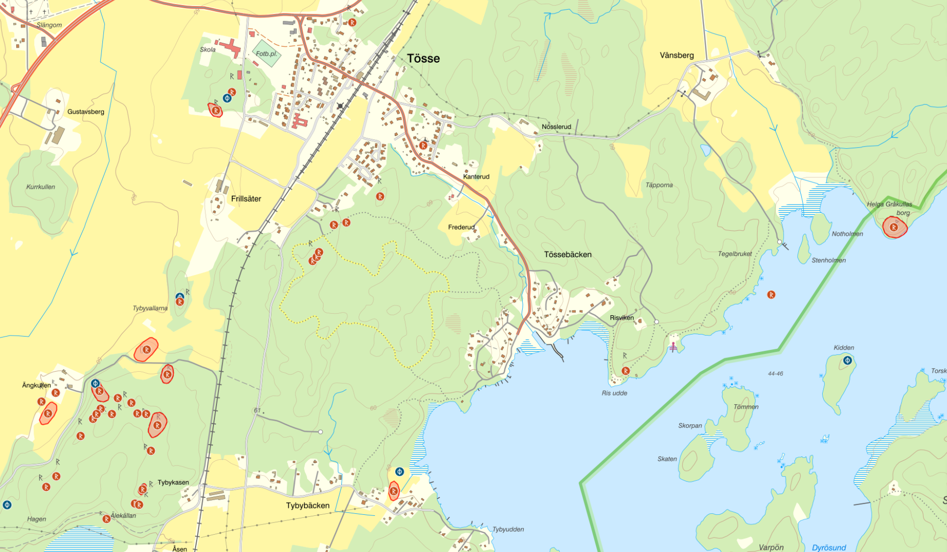 - Fornlämningar nära Tössebäcken (se Fornsök)